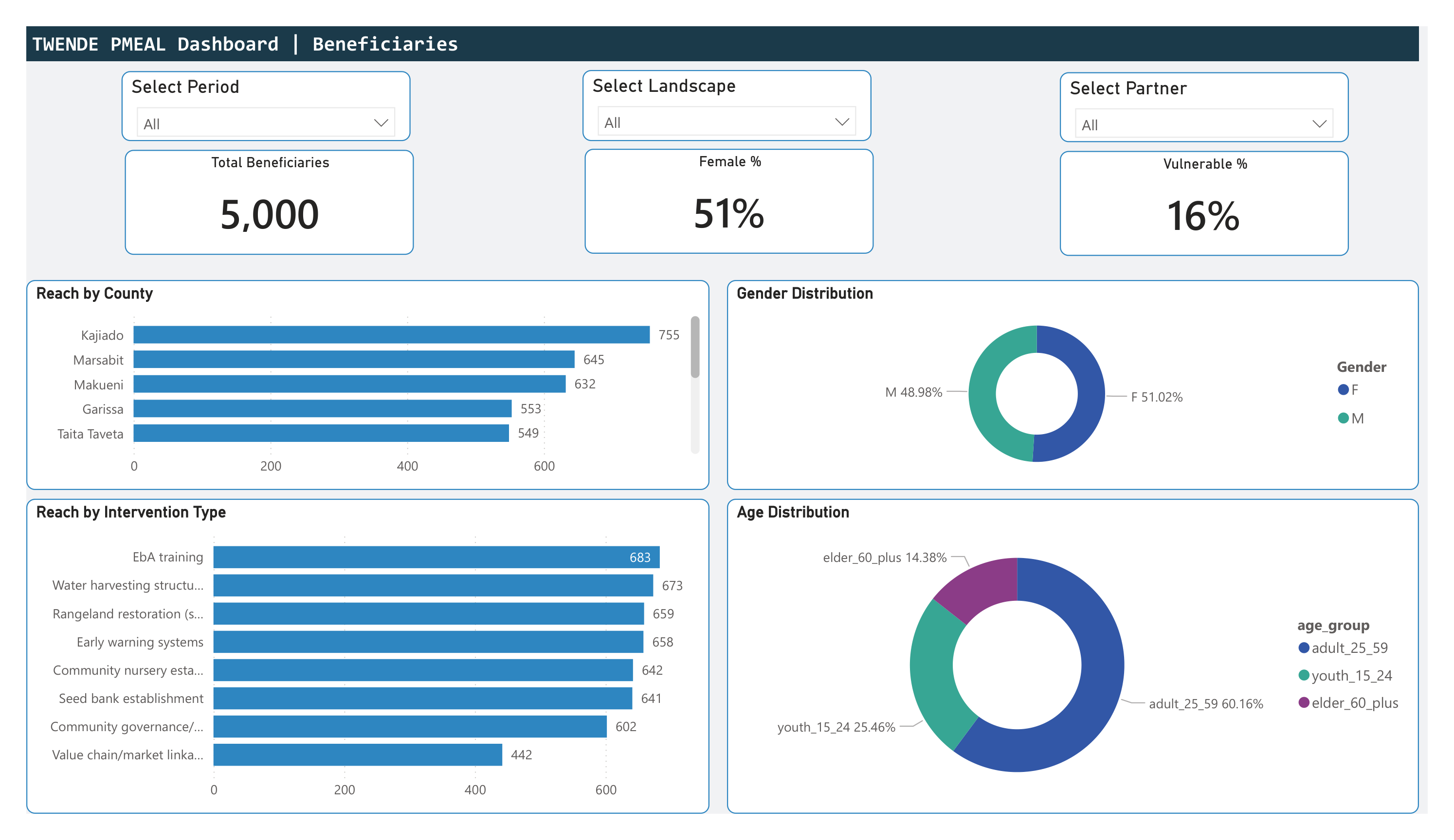 Individual-level tracking across 5,000 records. Reach by county, gender distribution (51% female), age group breakdown (60% adult, 25% youth, 15% elder), vulnerability status (16%), and reach by intervention type across all eight categories.