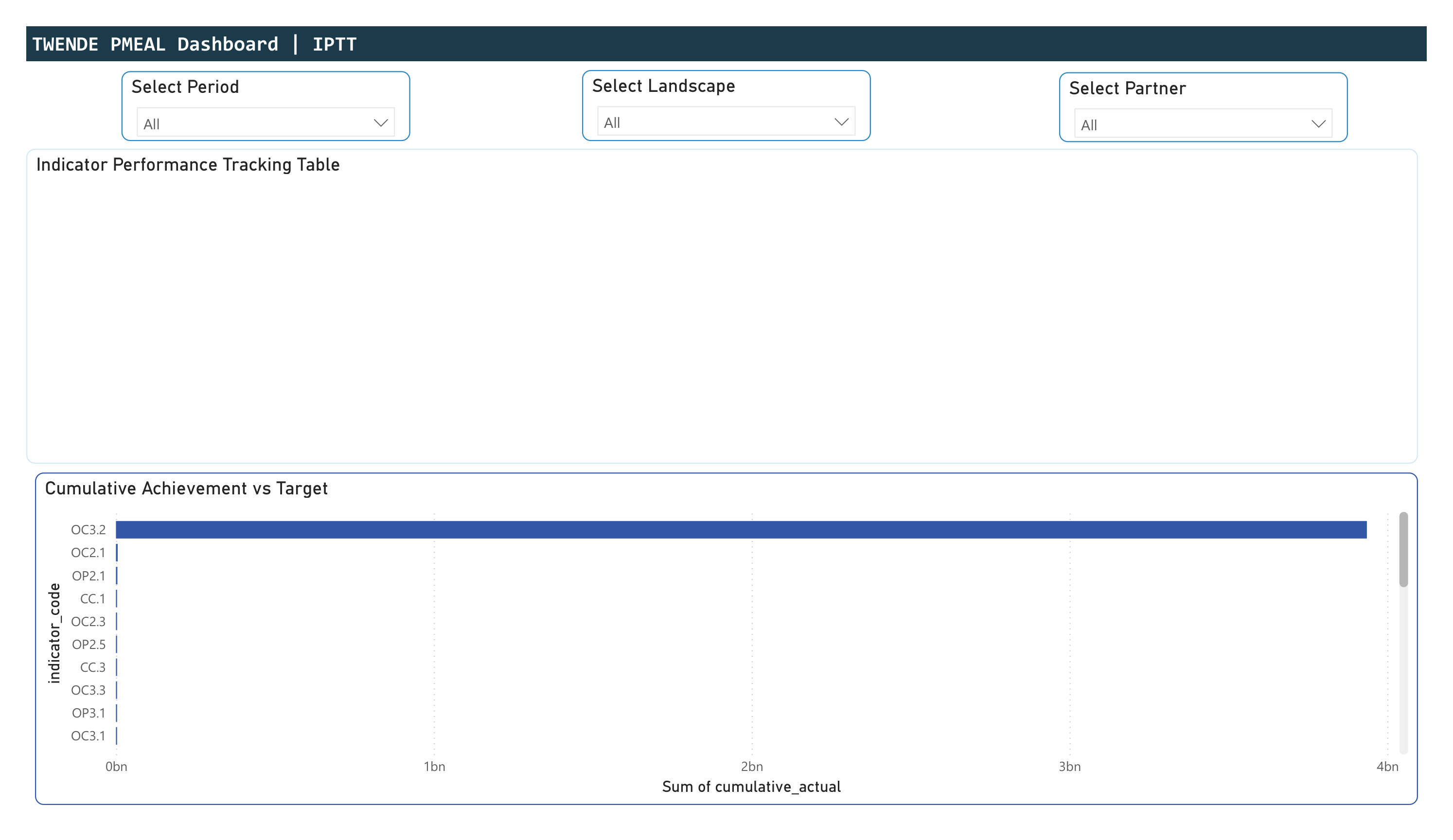 Cumulative achievement versus target for each log frame indicator (32 indicators across 3 components + cross-cutting). Designed for traffic-light conditional formatting enabling the MEAL team to identify on-track, at-risk, and behind-schedule indicators.