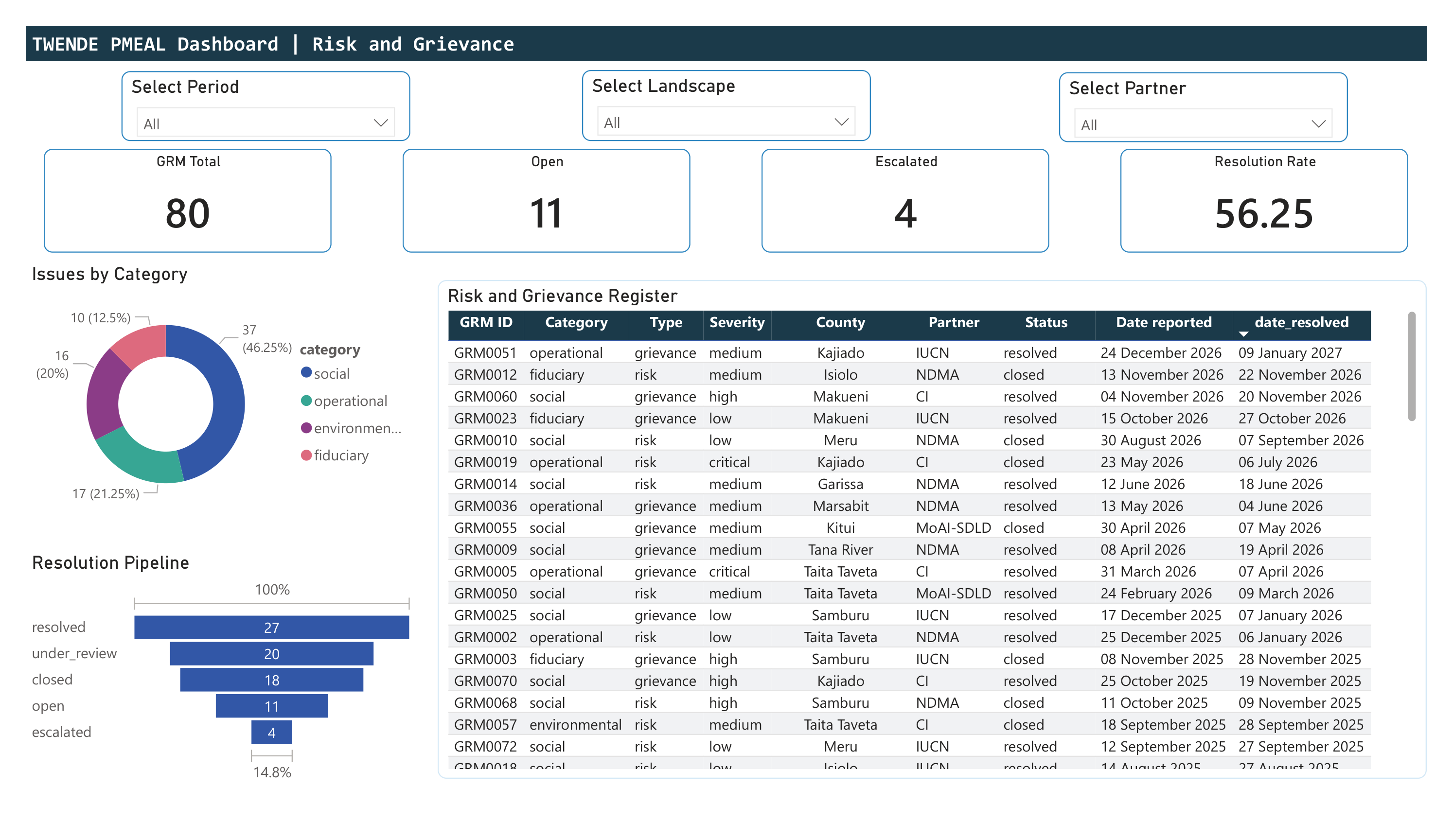 80 cases tracked across four categories (social, operational, environmental, fiduciary). Resolution pipeline from open through escalated to resolved. Full register table with GRM ID, severity, county, partner, status, and reporting/resolution dates.