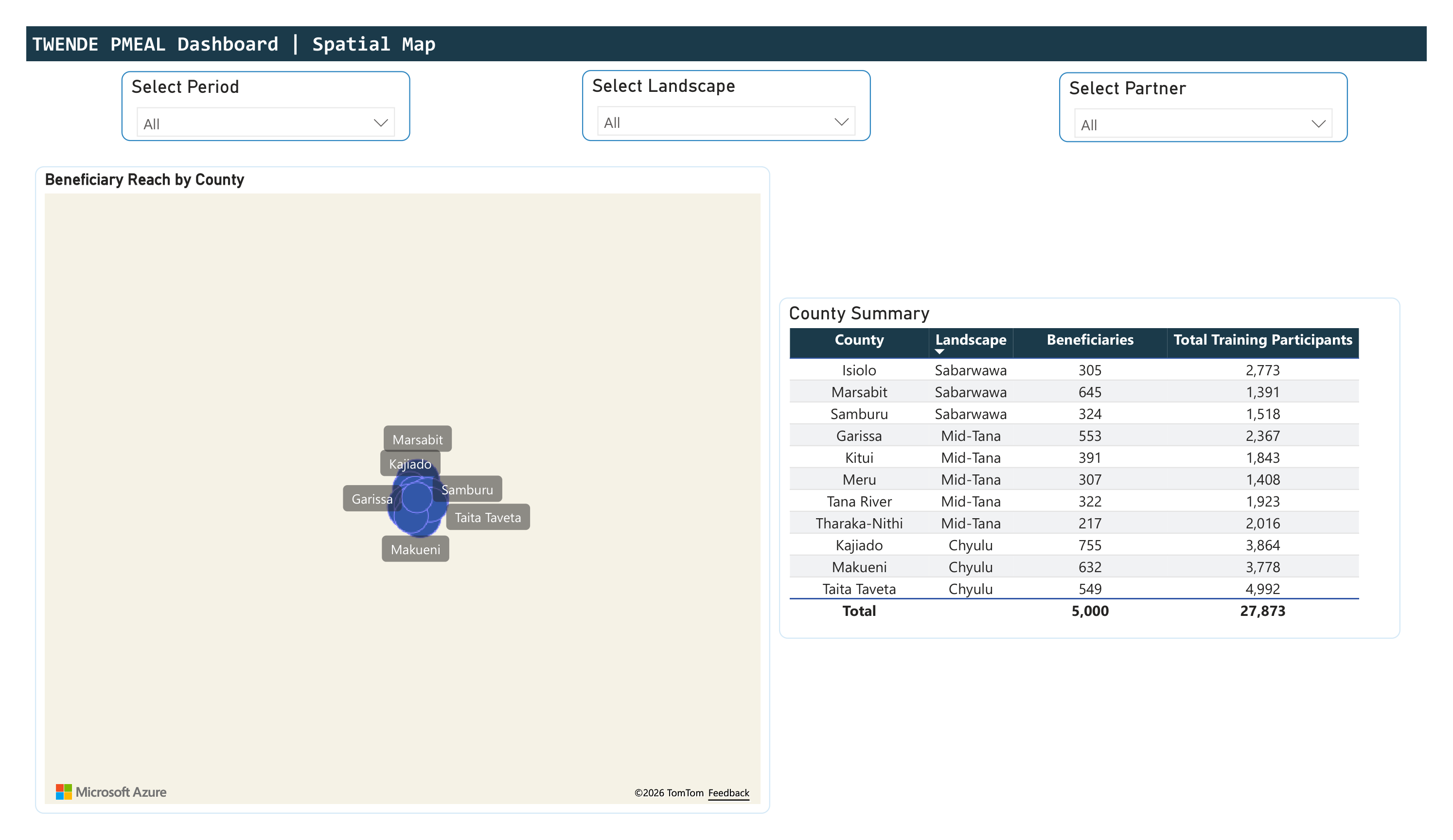 Azure Maps visualisation plotting beneficiary reach as proportional bubbles on county centroids across Kenya's ASAL region. County summary table showing beneficiary count and training participant totals grouped by landscape (Chyulu, Mid-Tana, Sabarwawa).